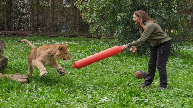 İzmir’in Torbalı ilçesinde güvenlik güçleri tarafından bir çiftliğe yapılan baskında ele geçirilen yavru aslan, İzmir Büyükşehir Belediyesi Doğal Yaşam Parkı’na teslim edildi. Henüz 10 aylık olduğu tahmin edilen ve uygun olmayan koşullarda yalnızca kedi maması ile beslendiği belirlenen yavru aslan bir ay süren tedavi ve bakımın ardından kendini toparladı. Minik yavru günlerini veteriner hekimlerin gözetiminde oyunlar oynayarak geçiriyor.