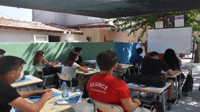 Güzelbahçe ilçesinde eğitim veren özel bir lise, pandemi nedeniyle bina içindeki sınıf ortamını bahçeye taşıyarak yüz yüze eğitime başladı. Bu yıl YKS'ye hazırlanması gereken lise son sınıf öğrencileri, tıpkı geçmişte olduğu gibi sınıf ortamında eğitime devam ediyor. Okulun bahçesindeki farklı noktalara kurulan 5 portatif sınıfta, biyolojiden matematiğe kadar tüm dersler işlenebiliyor. Ders aralarında verilen teneffüslerde ise öğrencilerin rahatlaması için gitar eşliğinde müzik dinletisi sunuluyor.