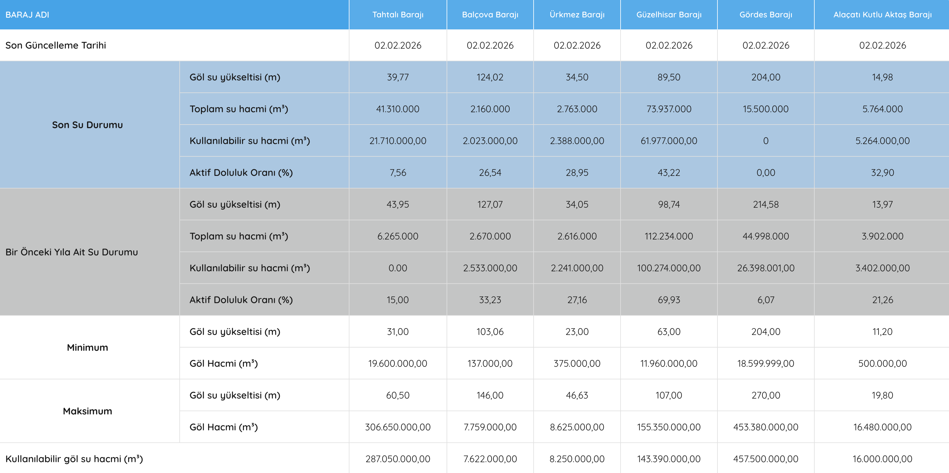 Balçova Barajı’nda kullanılabilir su hacmi 2 milyon 23 bin metreküp olurken, aktif doluluk oranı yüzde 26,54 olarak ölçüldü. Ürkmez Barajı’nda ise kullanılabilir su miktarı 2 milyon 388 bin metreküp, aktif doluluk oranı yüzde 28,95 oldu. Her iki barajda da yağışlara rağmen doluluk oranlarının sınırlı arttığı görüldü.