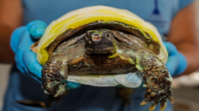Tedavisi süren kaplumbağa, İzmir Doğal Yaşam Parkı’na sevk edildi. Tedaviye yanıt vermesi ve tam anlamıyla iyileşmesi halinde yaşam alanına geri dönecek.