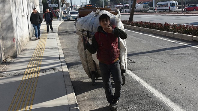 Alsancak Garı yakınında, boyundan büyük el arabasını çekerken görüntülenen bir çocuk, İzmir'de yaklaşık 700 bin öğrencinin karne aldığı bir günde, eve ekmek götürebilmek için çalıştı, çöp konteynerlerin atık malzeme topladı. Yaşıtları gibi okula gitmek yerine, buz gibi havada hurda toplamaya çıkan çocuğun görüntüse yürek burktu. (DHA)