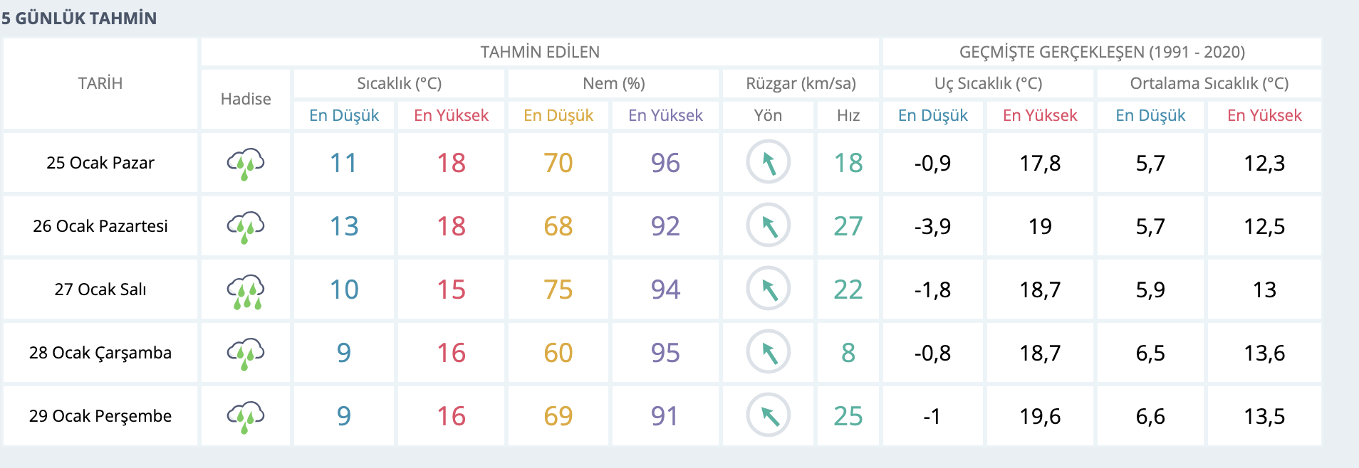 27 Ocak Salı günü yağış devam ederken sıcaklıklar bir miktar düşecek. Günün en düşük sıcaklığı 10, en yüksek sıcaklığı 15 derece olacak. Nem oranı yüzde 75’in üzerine çıkacak.