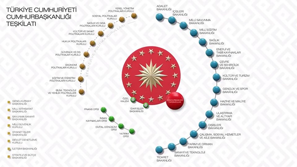 Yeni modele göre, bakanlıklar birleştirilerek bakanlık sayısı 26'dan 16'ya düşürülecek.