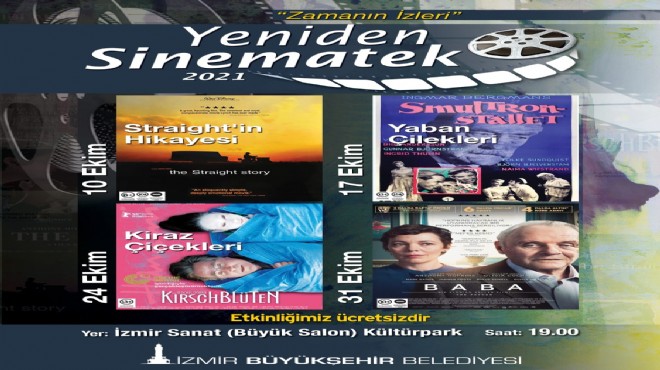 Büyükşehir Belediyesi “Yeniden Sinematek” ile sinemanın kült filmlerini İzmirli sanatseverlerle buluşturmaya devam ediyor. Büyükşehir Belediyesi Ekim ayında “Zamanın İzleri” temasıyla sinema tarihine damga vurmuş dört filmi izleyiciye sunacak. Cuma günleri 20.00’de yapılan Yeniden Sinematek gösterimleri, pazar günleri saat 19.00’a alındı. Gösterimler Kültürpark İzmir Sanat’ta ücretsiz sunulacak.