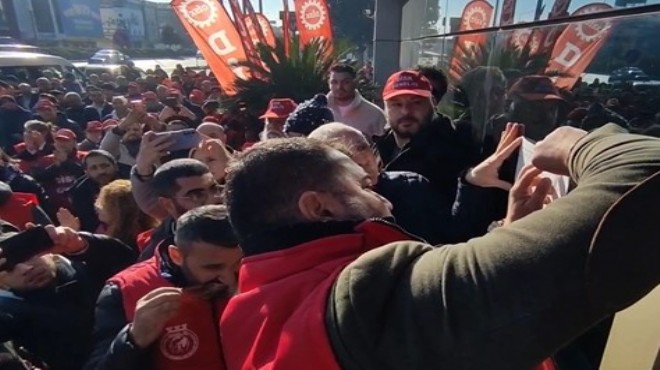 Bugün Karabağlar Belediyesi hizmet binası önünde toplanan yüzlerce sendikalı işçi grev kararını belediye binasına astı.