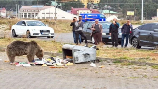 Ormanlık alana yakın bir yerleşim yeri olan TOKİ konutları bölgesine gelen boz ayı, çöp konteynerlerini devirerek yiyecek aradı.