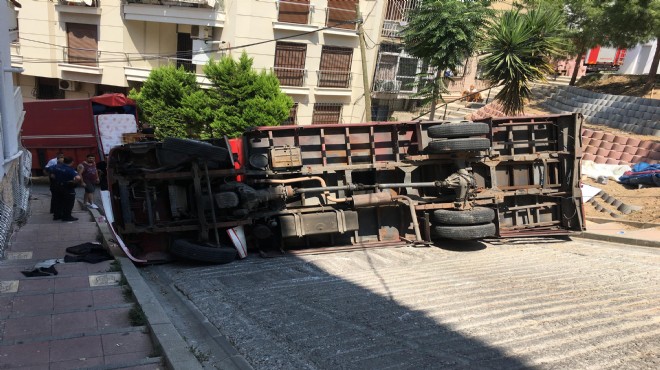 Kaza, bugün saat 14.30 sıralarında Murat Reis Mahallesi 199 Sokak'ta meydana geldi. Evden eve taşımacılık yapan A.D.'nin kullandığı 06 BJE 779 plakalı nakliye kamyonu, yokuş çıkarken önündeki otomobil nedeniyle durmak zorunda kaldı. İddiaya göre eşya yüklü kamyon, yokuşta tekrar kalkış yapamayıp, geri kayarak kontrolden çıktı. Devrilerek yolu tamamen kapatan kamyonun şoförü A.D., yaralandı. Çevredekilerin ihbarı üzerine kaza yerine 112 Acil Servis ve itfaiye ekipleri sevk edildi. Ayağından hafif yaralanan kamyon şoförü A.D., olay yerindeki ilk müdahalenin ardından İzmir Katip Çelebi Eğitim ve Araştırma Hastanesi'ne kaldırılıp, tedaviye alındı. Polis, kazayla ilgili soruşturma başlattı. (DHA)