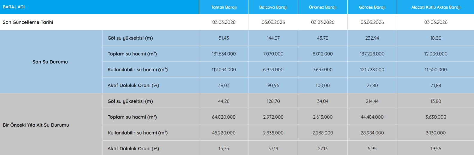 İZSU’nun 3 Mart 2026 tarihli verilerine göre İzmir’in en önemli içme suyu kaynaklarından Tahtalı Barajı’nda aktif doluluk oranı yüzde 39,03 olarak ölçüldü. Tahtalı Barajı’nda yağışların mola vermesi ile artış hızı düştü. Barajda 2 Mart Pazartesi günü doluluk oranı 38,88 olarak ölçülmüştü.