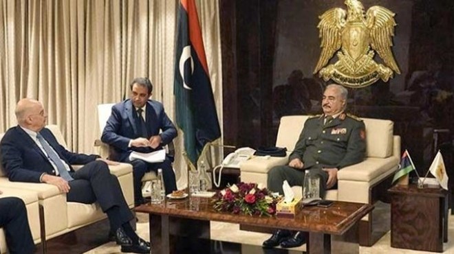 Basında Dendias'ın darbeci milis lideri Hafter ile bir araya geldiği fotoğraflar yayımlandı.